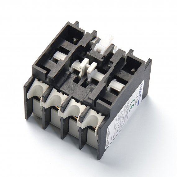 Контактная приставка содержит 4 контакта. НЗ контакты замкнуты в нормальном состоянии — пока на катушке контактора отсутствует напряжение. Размыкаются с появлением напряжения на катушке.