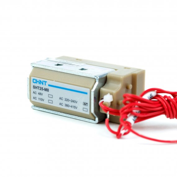 Независимый расцепитель Chint SHT25-M8 отключает автоматический выключатель при подаче на него напряжения 110 вольт переменного тока. Применяется для реализации электрических взаимных блокировок, удалённого управления и подключения внешних защитных устройств: реле напряжения, дифференциального реле, реле контроля изоляции и других.