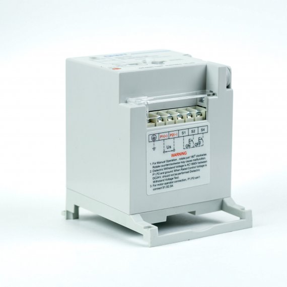 Моторный привод автоматического выключателя Chint серии NM8N габарита 125. Предназначен для дистанционного включения и выключения автоматического выключателя. Устанавливается вместо лицевой панели и воздействует непосредственно на рычаг управления автоматом. Представляет из себя мотор-редуктор со встроенными концевыми выключателями. Оснащён съёмной рукояткой ручного управления и кнопкой тестирования. Дистанционное управление приводом осуществляется путём кратковременного замыкания контактов клемм, соответствующих положению «включено» или «отключено».