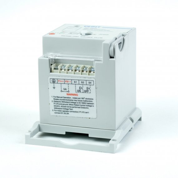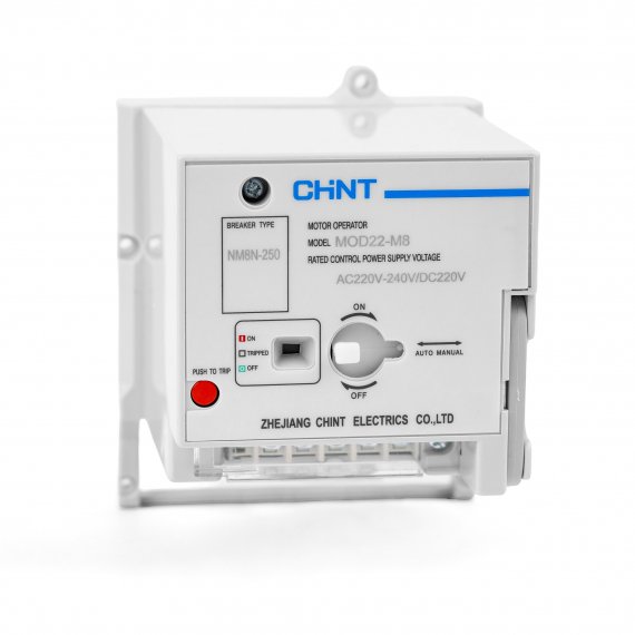 Моторный привод автоматического выключателя Chint серии NM8N габарита 250. Предназначен для дистанционного включения и выключения автоматического выключателя. Устанавливается вместо лицевой панели и воздействует непосредственно на рычаг управления автоматом. Представляет из себя мотор-редуктор со встроенными концевыми выключателями. Оснащён съёмной рукояткой ручного управления и кнопкой тестирования. Дистанционное управление приводом осуществляется путём кратковременного замыкания контактов клемм, соответствующих положению «включено» или «отключено».