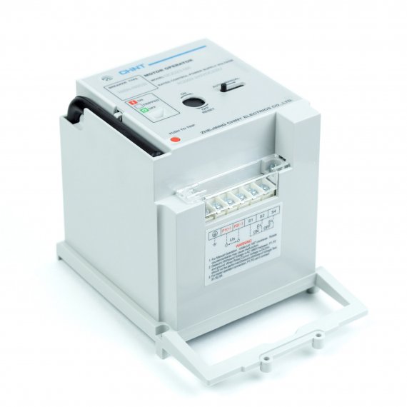 Моторный привод автоматического выключателя Chint серии NM8N габарита 800. Предназначен для дистанционного включения и выключения автоматического выключателя. Устанавливается вместо лицевой панели и воздействует непосредственно на рычаг управления автоматом. Представляет из себя мотор-редуктор со встроенными концевыми выключателями. Оснащён съёмной рукояткой ручного управления и кнопкой тестирования. Дистанционное управление приводом осуществляется путём кратковременного замыкания контактов клемм, соответствующих положению «включено» или «отключено».