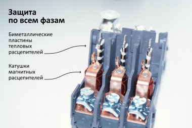 Мотор-автомат снабжён магнитным расцепителем для защиты от токов короткого замыкания. В отличии от обычного автомата расцепитель настроен на 18-ти кратное превышение номинального тока для исключения ложных срабатываний при запуске двигателя.